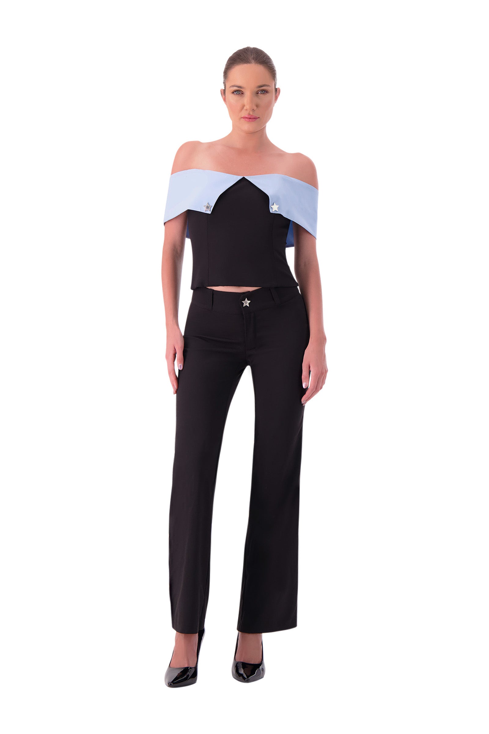 The Ingénue Corset–sleeveless corset features a fold-over collar, secured with star snap buttons. Features a lace up back for an adjustable fit.